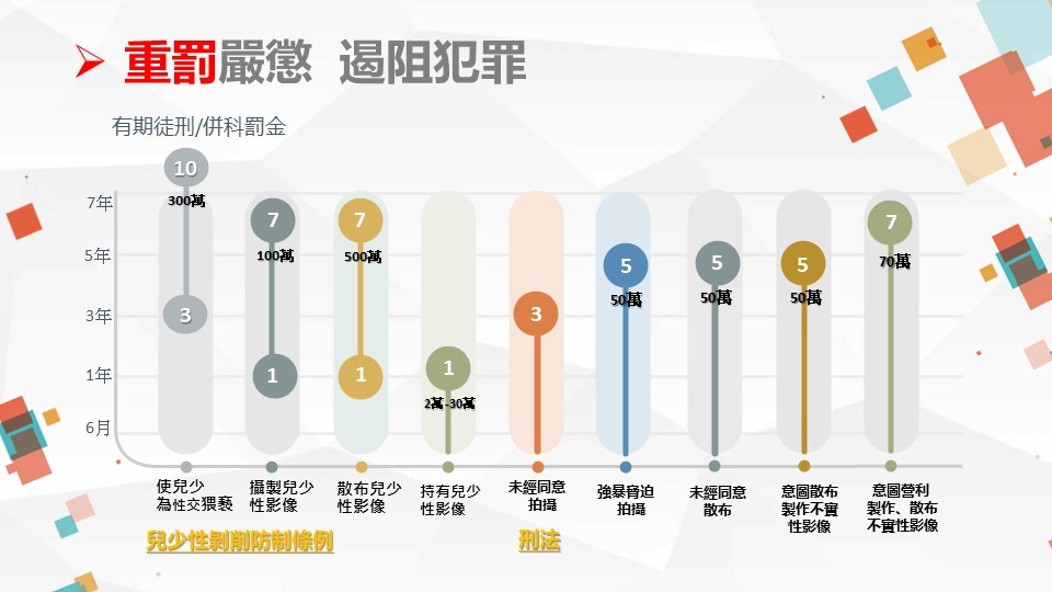 首先,在「中華民國刑法」增訂「性影像」定義及「妨害性隱私及不實性影像罪」專章,明定4種犯罪行為態樣;在「兒童及少年性剝削防制條例」,則對於不法拍攝、製造、散布兒少性影像者均加重刑責,以嚴懲重罰的方式,保護兒童及少年身心健全發展,避免各種形式的剝削、侵害。